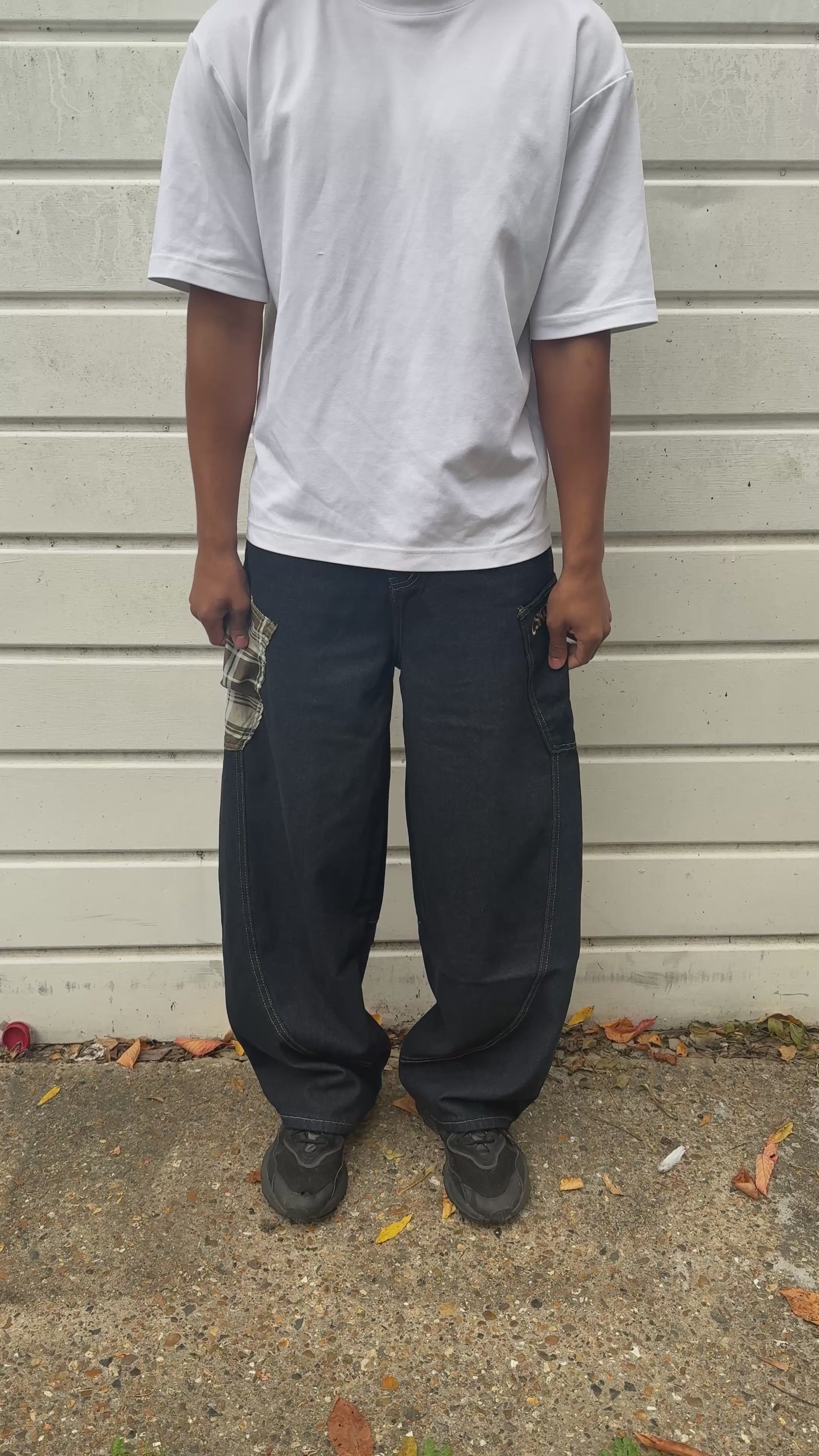 Beige Plaid Patch Baggy Jeans